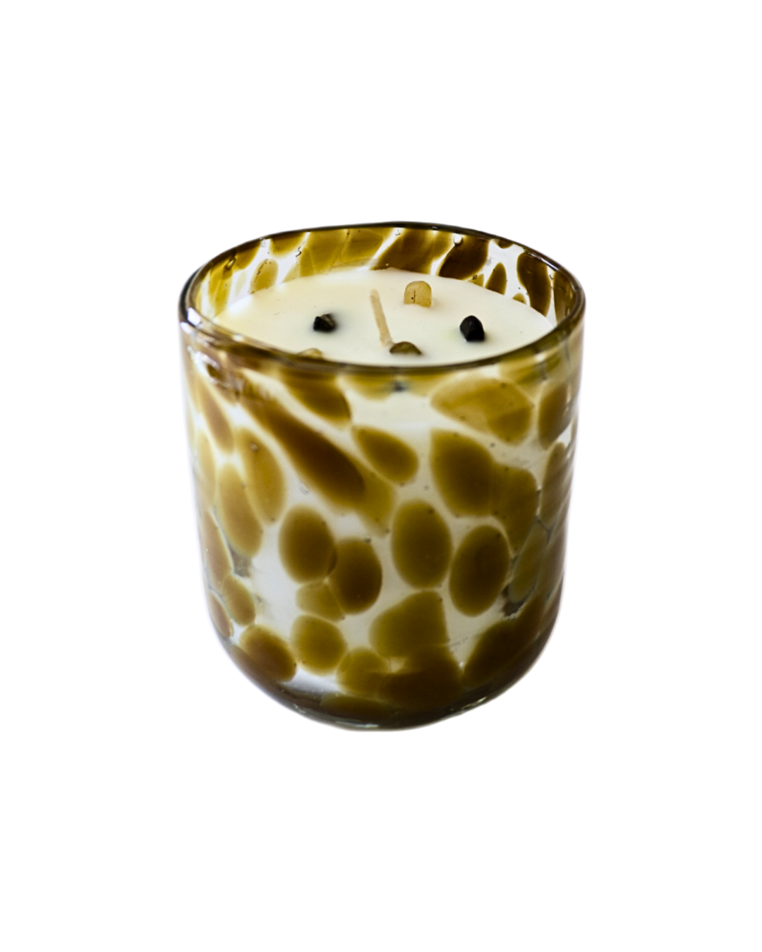 Bougie en verre avec pierres citrines en décorations.